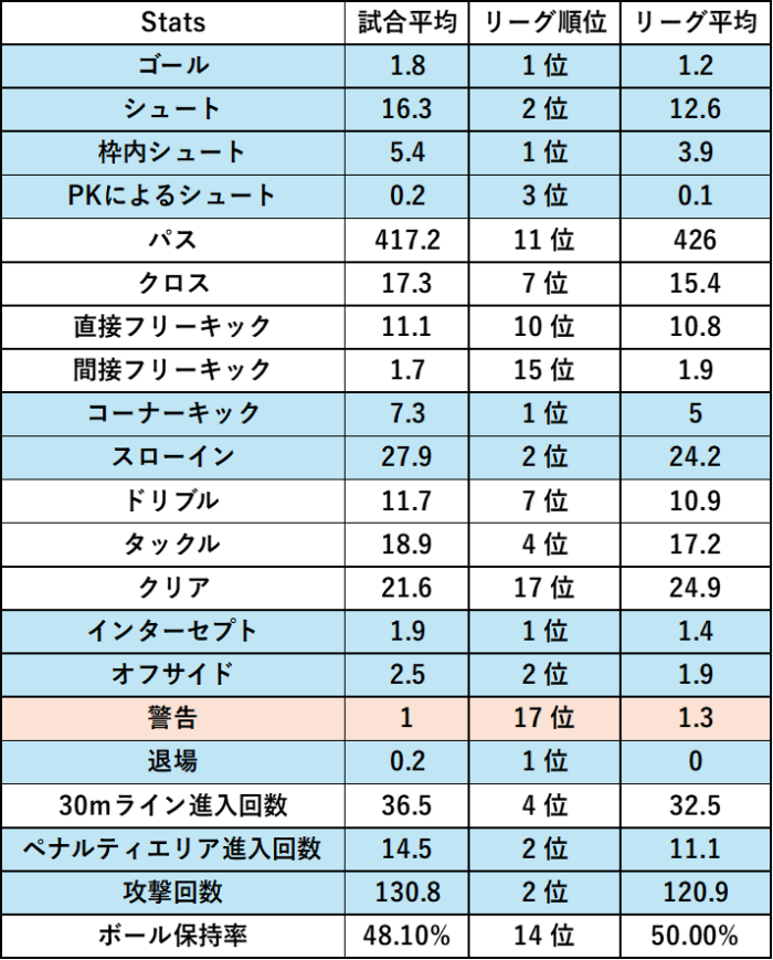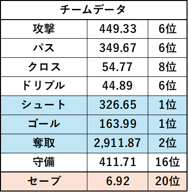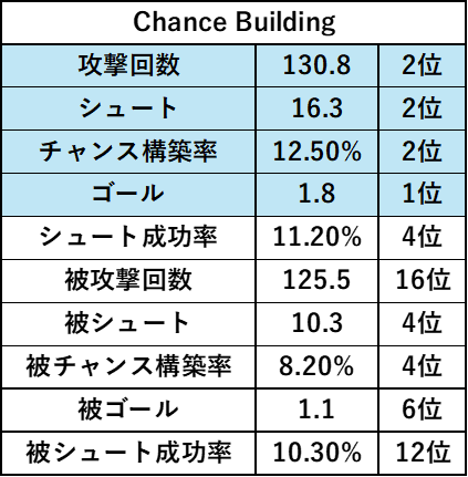 チャンススタッツとしては攻撃の数値がリーグ1、2位に位置しています