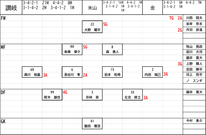対する鳥取。いつも右WBの丸山選手がて前節ベンチ外は気になりますが代わりに入った田中選手がアシストを決めた事もあり悩むところです