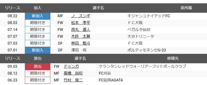 途中加入も監督交代前後であり昨年まで讃岐にいた松本選手を呼び戻すなどしています