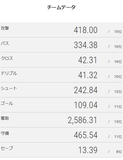 スタッツもリーグ中位が多く特徴が無いですが順位が下位という事は上手く噛み合ってないのかも知れません