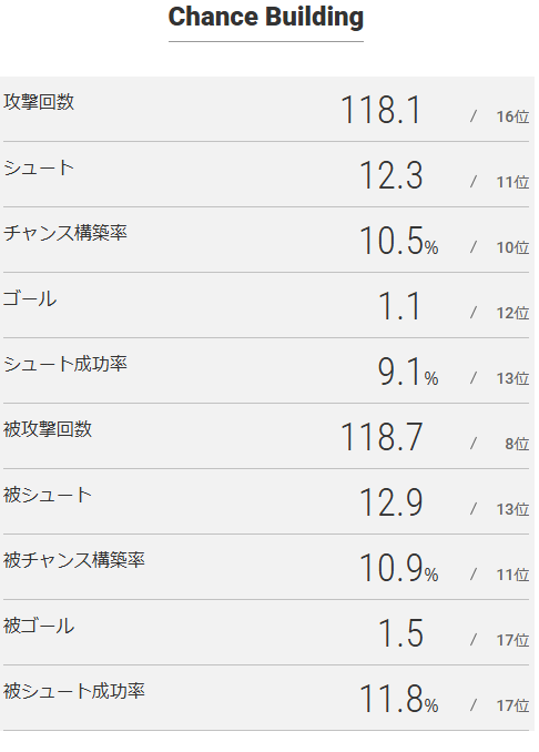 チャンスビルディングもチームデータもリーグ中位であり大きな特徴が無いところが特徴であり、短所でもあります