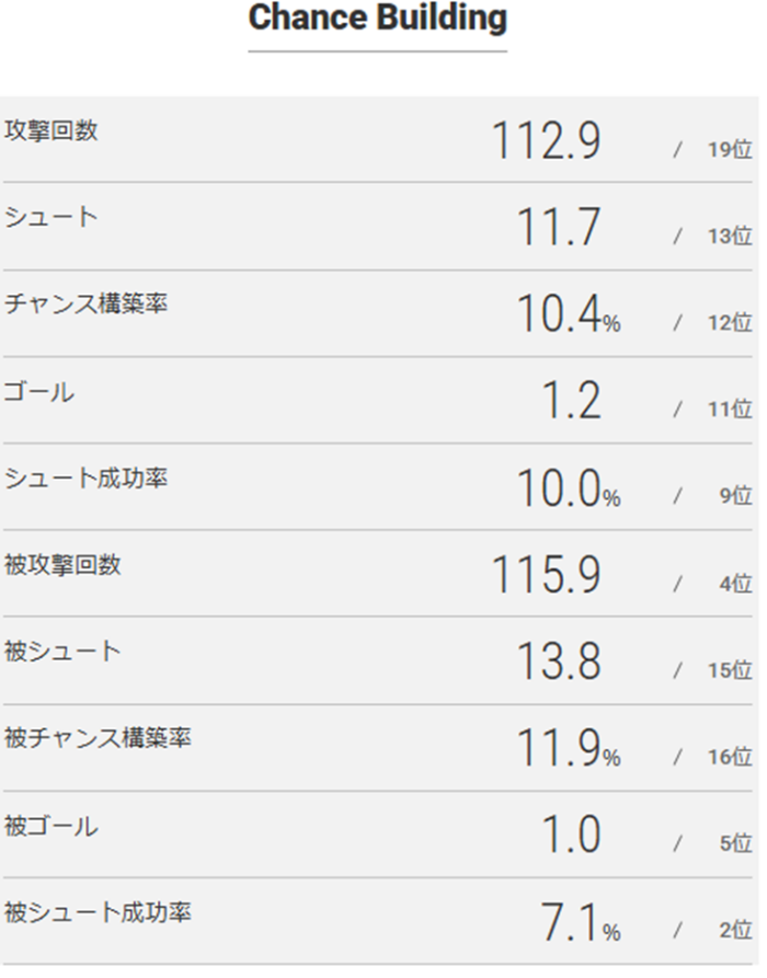 チャンスビルディングポイントも守備がリーグ3位と守備意識が高いことが分かります