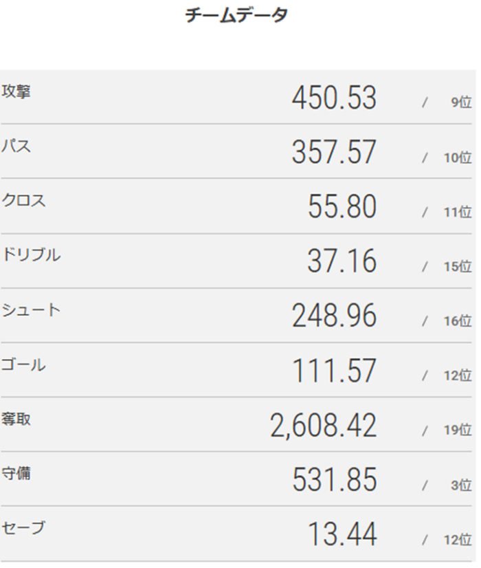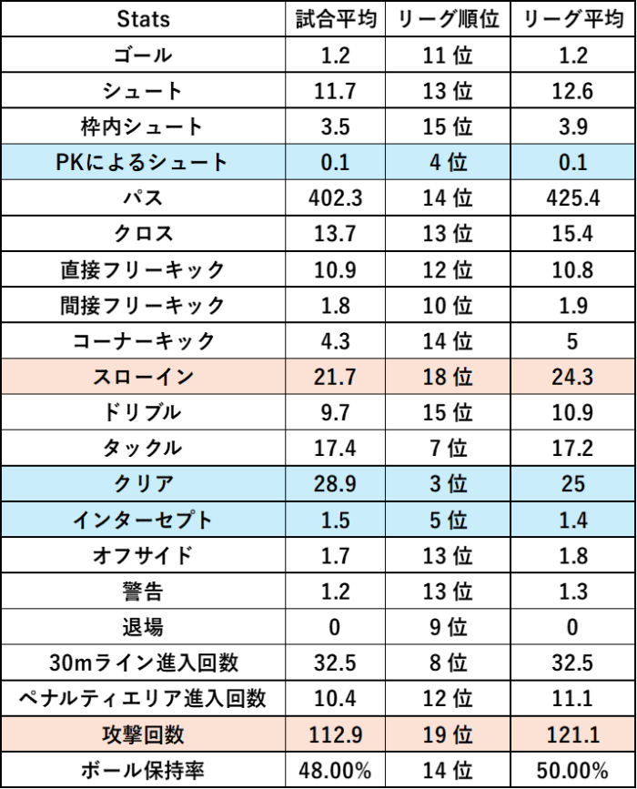 チームスタッツとしては攻撃回数がリーグ下位、クリアとインターセプトが上位という事で少し守備的にしているチームかも知れません