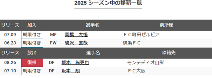 シーズン中の移籍はなんと言っても昇格時の中心選手の高橋選手の加入がインパクトがあります