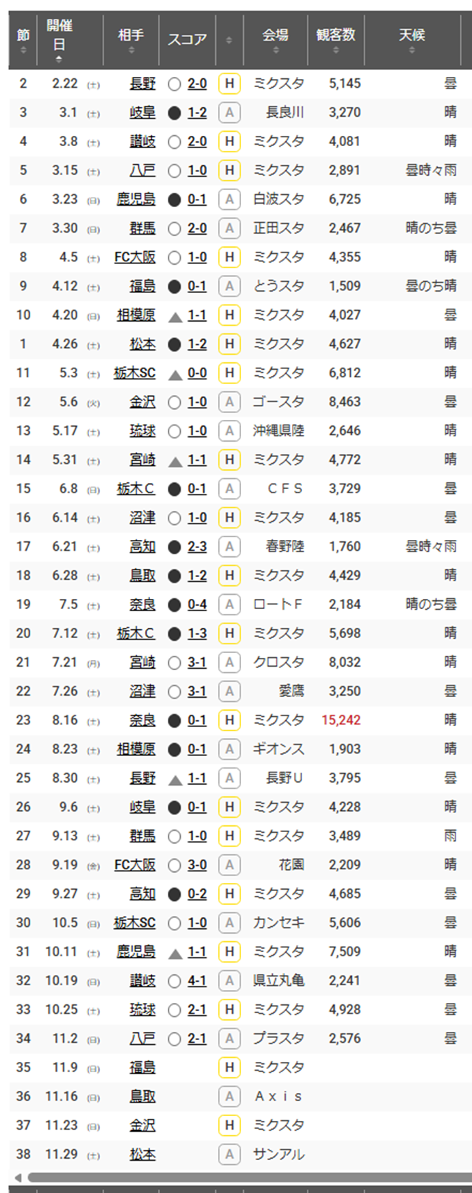 シーズン成績は鳥取敗戦後に2連敗を喫し4連敗その後4戦勝ちなしもありましたが徐々に勝ちが繋がり前節は福島に敗戦しました