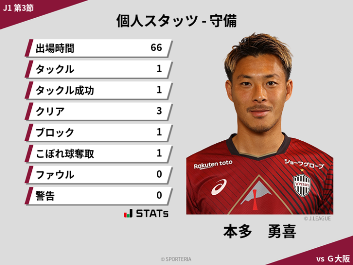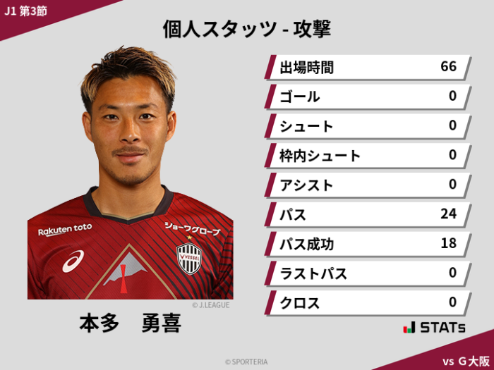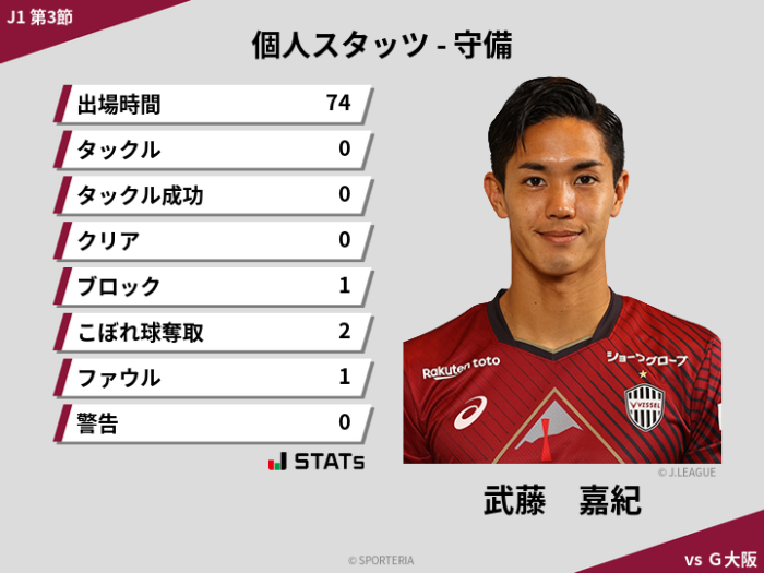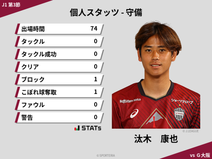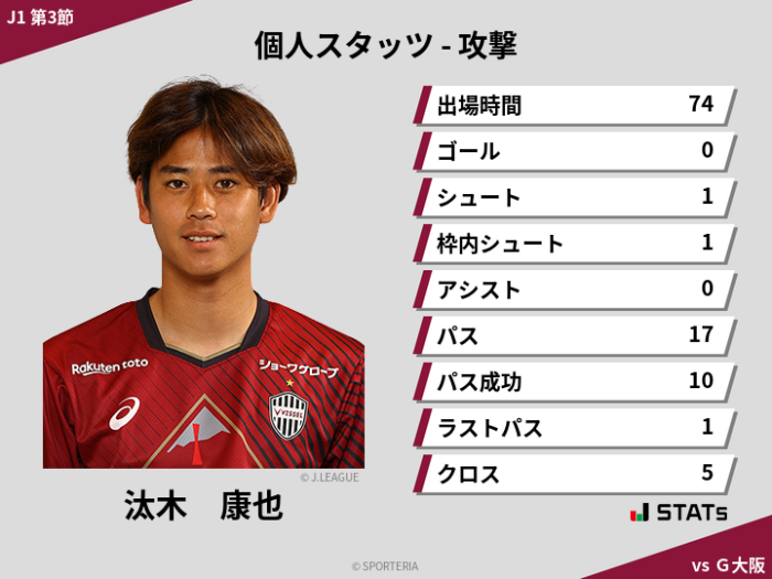 汰木康也→前半9分に武藤へとクロスを送るも谷の好判断に阻まれ、後半開始直後には強烈なシュートを放つもこれも谷にセーブされてしまい今節もゴールに絡めず。