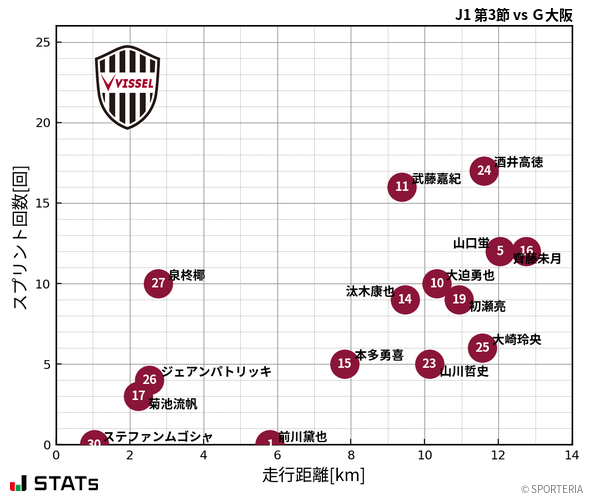 齊藤に次ぐ走行距離を記録し攻守に顔を出し続けて勝利に貢献した。
