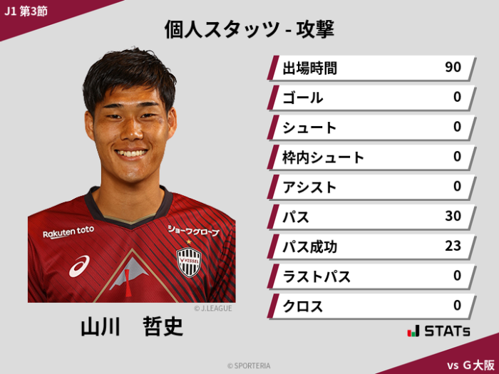 山川哲史→ビルドアップに詰まりロングボールを蹴ってくる相手に対して負けずに跳ね返した。イライラしたジェリバに後ろから押されるなどしたが90分間冷静にプレー。