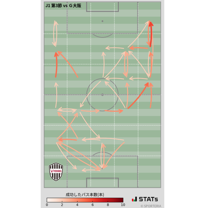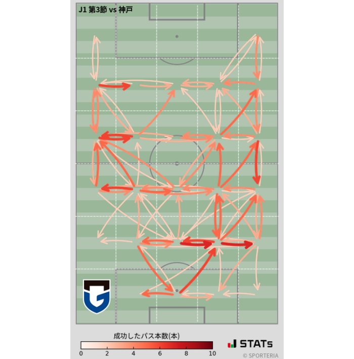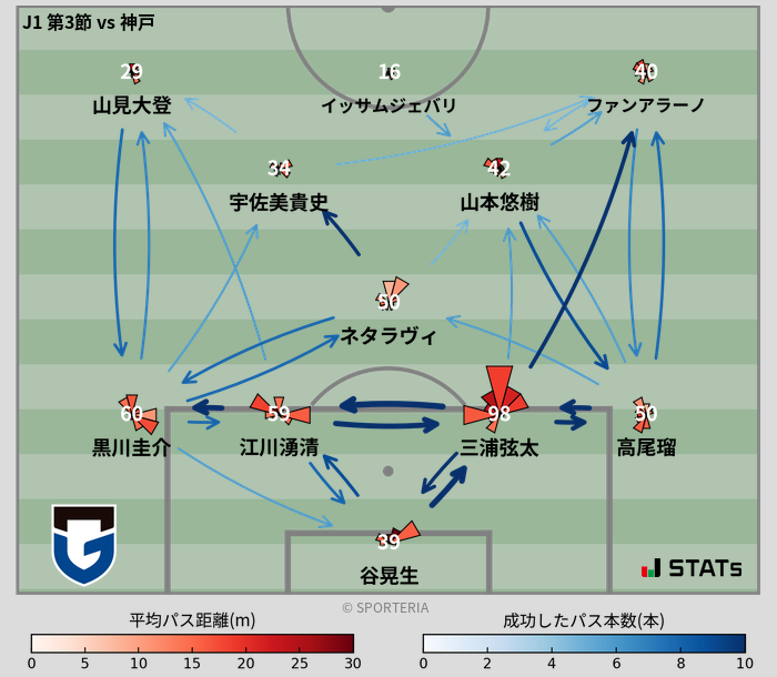 特に右CBの三浦弦太のパスの方向や距離が示すようにパスの回数は横パスやGKへのパスが多く前へのパスはパス距離が長くロングボールを多く蹴っていたことが分かる。