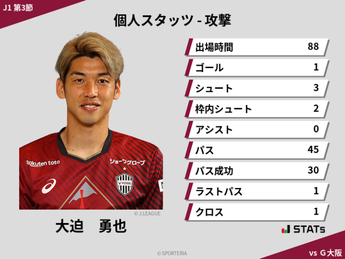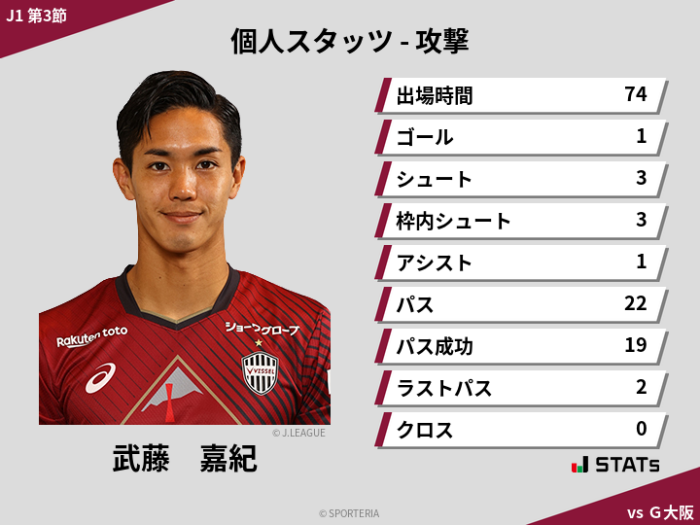 圧巻だったのは2点目、武藤からのパスを受けペナルティエリアに侵入すると目線でマイナス方向を見つつ最後はニア上を豪快に撃ち抜いて自身初の1試合2得点を記録した。