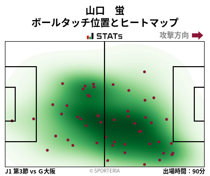 先制点となった場面ではディフェンスラインに出来たギャップに走り込む山口を見逃さずに素晴らしいスルーパスを送った。