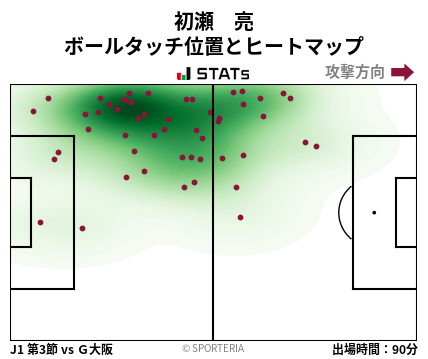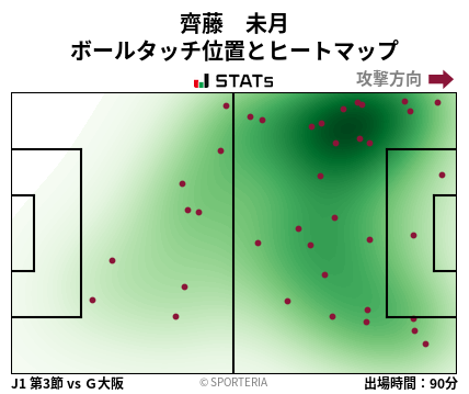 展開もありボールにあまり絡めずにプレスをかける役目に終始も16分とATの出場で走行距離2.7キロ、スプリント回数10回を記録するなど走り回った。(90分換算で約15キロ、スプリント約40回)