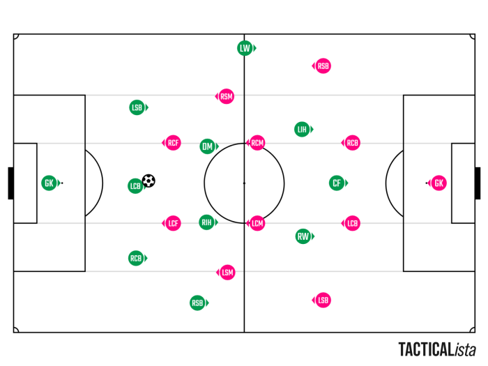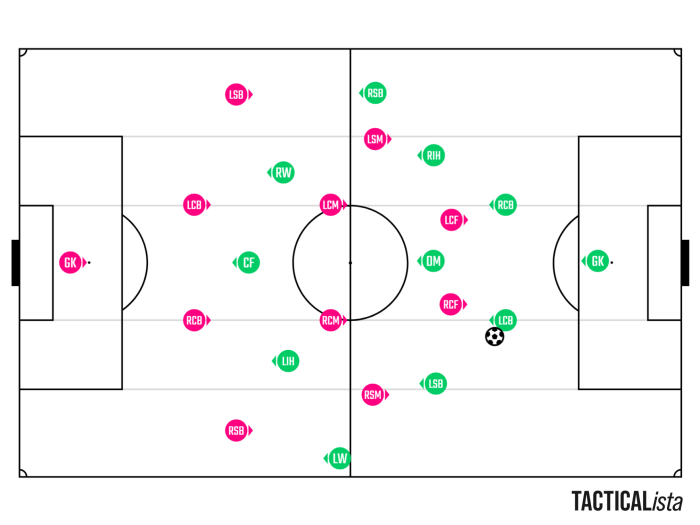 宮崎さんが積極的にハイプレスをしてくる事を見越して、CBで出場していた温井選手を左SBに変更し、2トップに対し3枚にする事で後ろでのボール回しを安定させたかったのだと思われる。