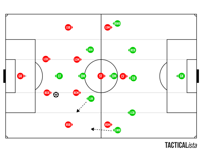 松本戦では右SB馬渡選手にボールが入った際に、低い位置ではIHの選手が中から出ていってチェック、中盤ではWBの選手が前にでて食い付く形。受け渡しもスムーズで、石崎監督がしっかりと守備組織を構築している事がうかがえる。