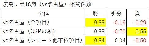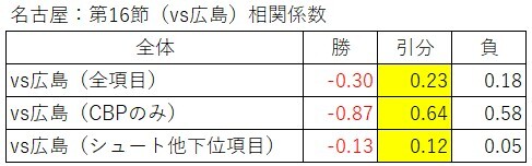 全て引分との相関係数が高かった。名古屋からすれば引分が妥当な数値データだったのだろう。引分と負との差が小さいことから、負ける可能性もそれなりにあったと解釈できる。以上を踏まえて、名古屋は悔しい負けなのかなと思う。