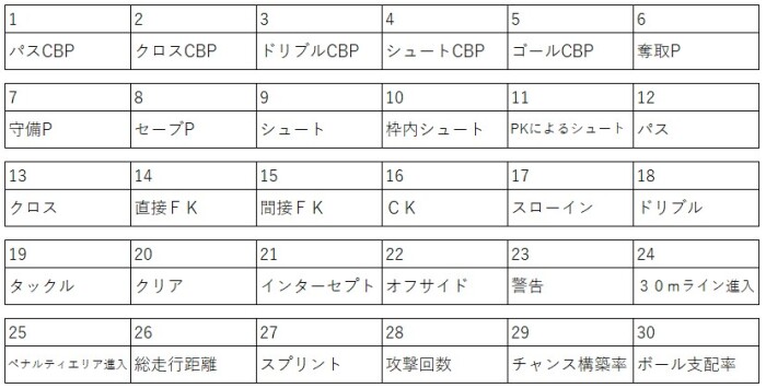30にわたる項目を使用しました。Football LABさんのデータには攻撃CBPとゴール期待値もありますが、攻撃CBPはパスCBPとクロスCBPとドリブルCBPを足したものであるから除外、またゴール期待値も、筆者が感覚的に入れない方が妥当だと考え除外しました。計算は広島、名古屋それぞれ行いました。