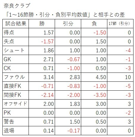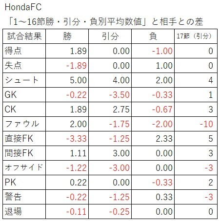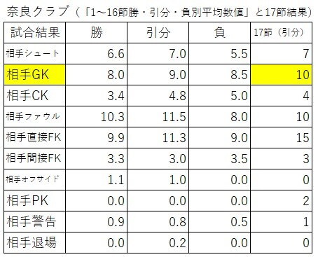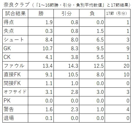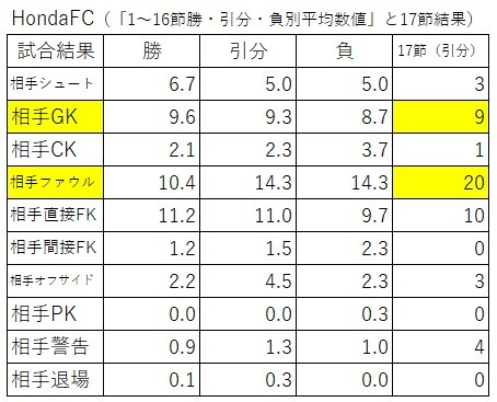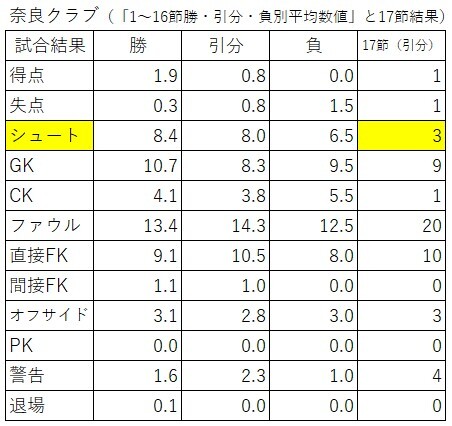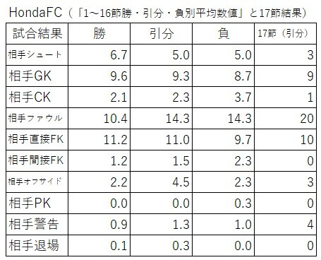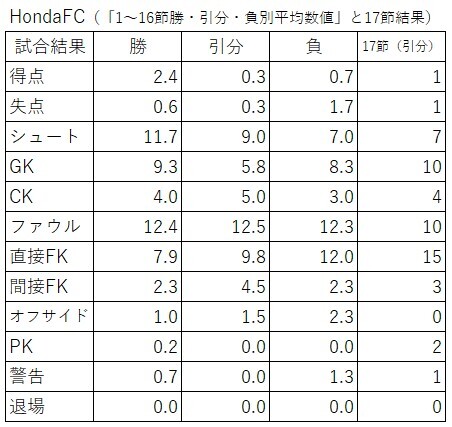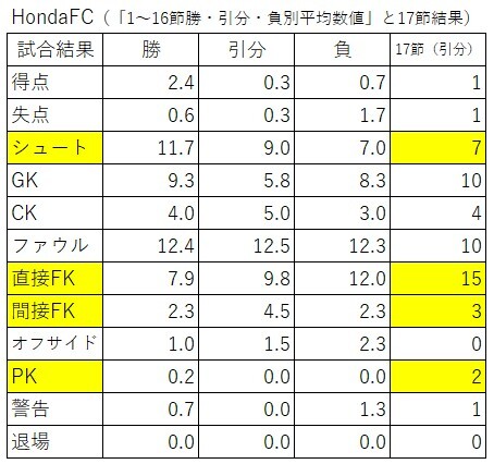 1~16節のスタッツを勝点別に集計し17節(引分)の結果を追加したのが下表である。
