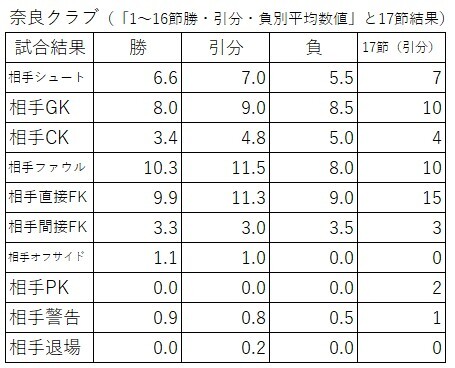 奈良クラブはシュート数が3本と非常に少ない。しかし相手GK(ゴールキック)は10本であり、エンドラインに到達する攻撃は回数、割合ともにHondaFCを上回っていた。ファウルは20回と多いが、HondaFCの攻撃をよく潰していた。そして2回あったPKのうち、1回をゴールキーパーのファインセーブで防いだことが、引分に終わった最大の原因であろう。
