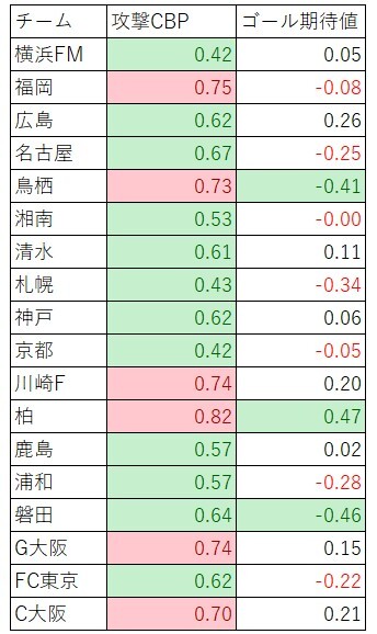 注目したのは下表に記載した攻撃CBPとゴール期待値である。