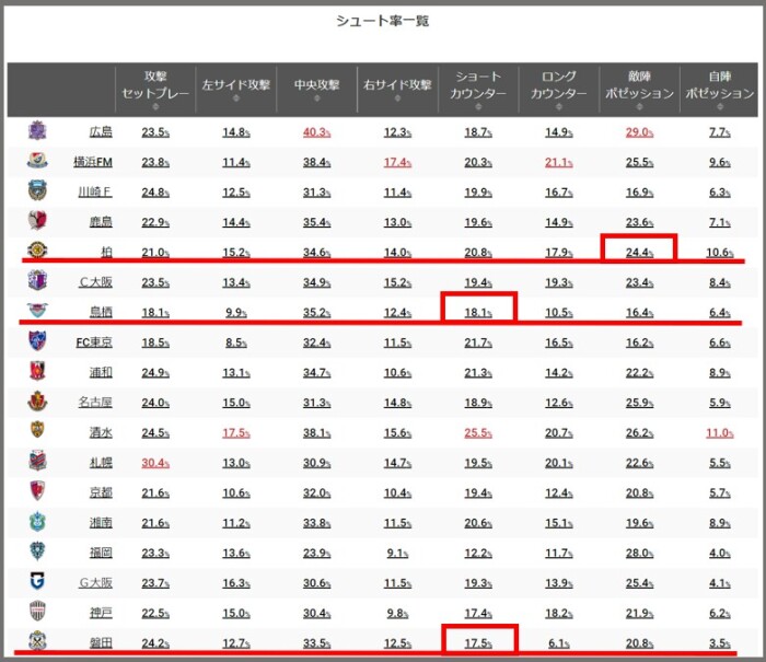 前述した柏、鳥栖、磐田について検証するためにチームスタイル指標におけるシュート率を下記に掲げる。