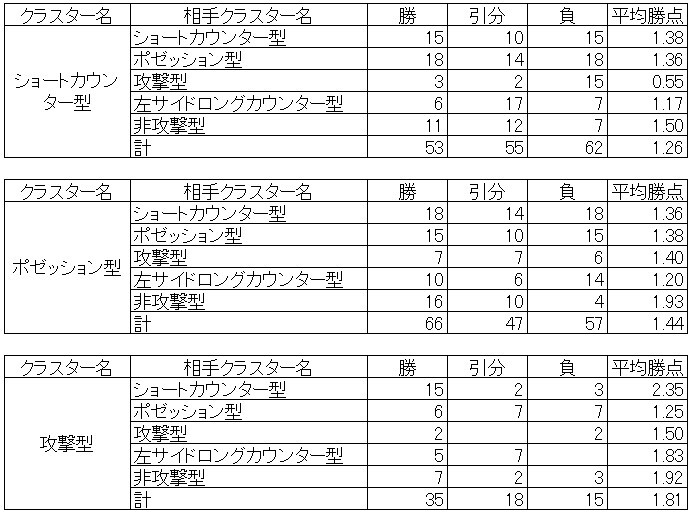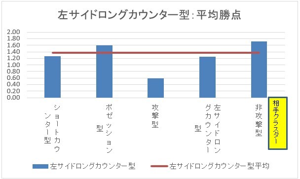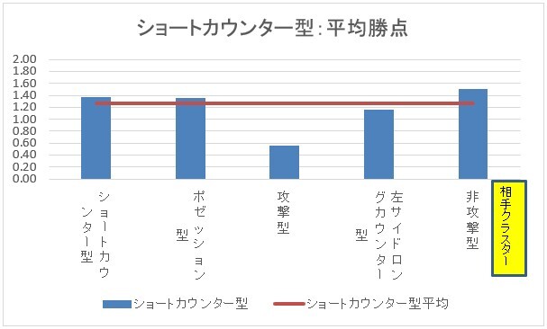 ショートカウンター型はショートカウンター型・ポゼッション型・非攻撃型と相性が良いです。同じクラスターであるショートカウンター型と対戦した時は、平均よりも勝ち負けがはっきりするということになります。攻撃型や左サイドロングカウンター型との相性は良くないです。特に攻撃型との相性は悪いです。