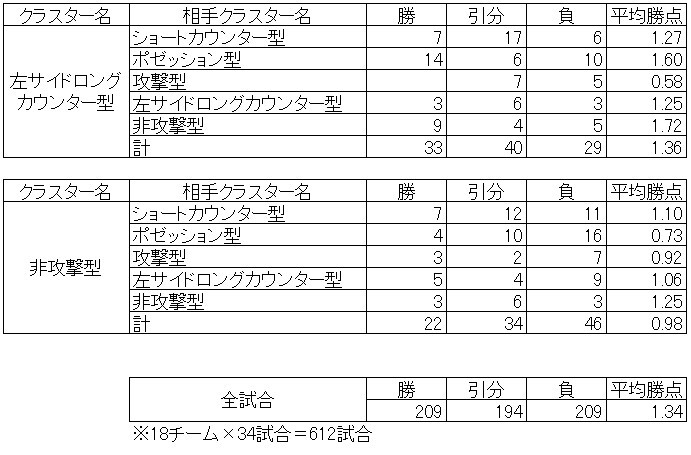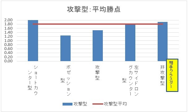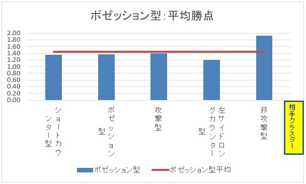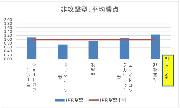 非攻撃型は5つのクラスターの中で最も勝点が少ないクラスターです。それでも相性はあるようです。非攻撃型は非攻撃型を相手にしたときに最も勝点が多く相性が良いです。ショートカウンター型・左サイドロングカウンター型との相性も比較的良いです。攻撃型よりもポゼッション型を相手にした方が勝点が少なく、最も相性が悪いです。じっくり攻められるのが苦手かもしれません。