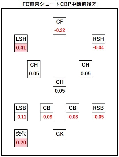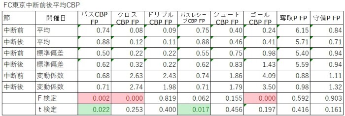 FC東京の中断前後のCBPは下表の通りです。この数字は選手個々のCBPの平均です。なおFPはフィールドプレイヤーを意味しています。