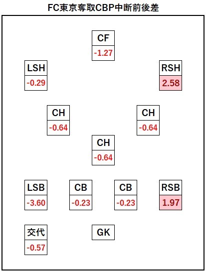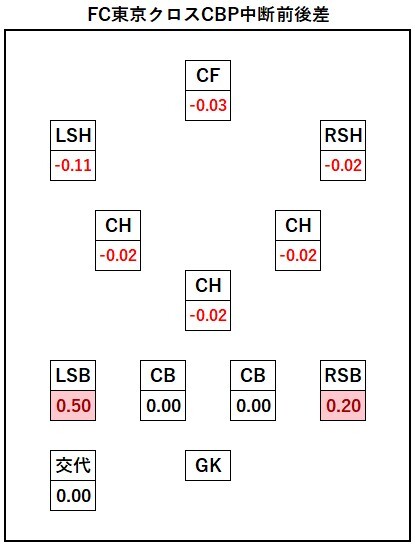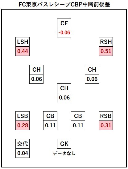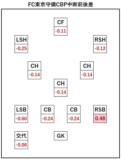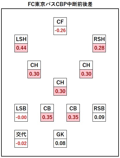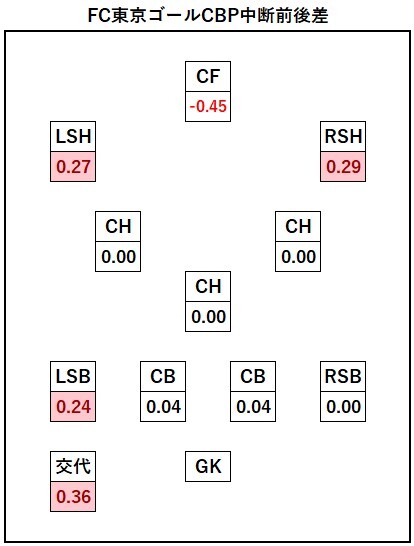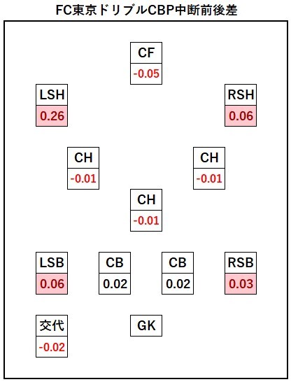 LSB、RSBの値が上昇しています。受けたパスはクロスへとつなげていたようです。クロスCBPが上昇したということは、かなり高い位置まで進入していたことも推測できます。FC東京は中断後、ポゼッション型へシフトしていきましたので、ボールを保持することで両SBが高い位置に進入することが可能になったのでしょう。