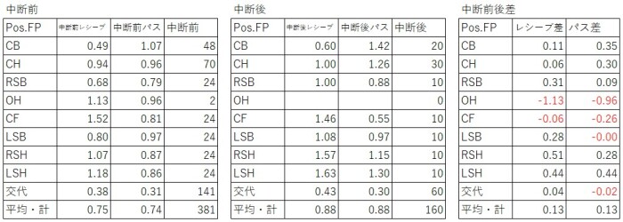 パスCBPとパスレシーブCBPの中断前後のポジション別の値は下表の通りです。中断前にOH(オフェンシブハーフ)を配置した試合が2試合あるようですが、試合数が少ないため除外します。