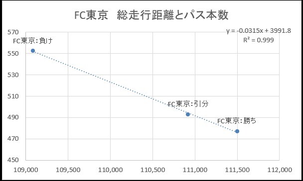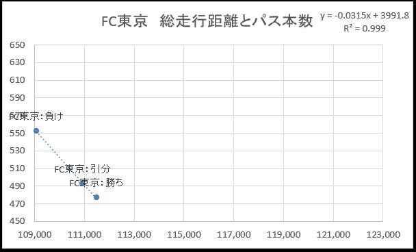 FC東京も鳥栖と同様に、勝ちや引き分けの場合、総走行距離が長くパス本数が少ないです。逆に負け試合の場合総走行距離が短くパス本数が増えます。