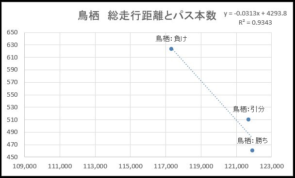 まず鳥栖です。勝ち・引分・負け試合ごとの平均総走行距離と平均パス本数を散布図にしました。