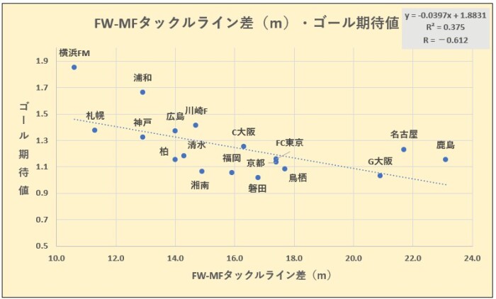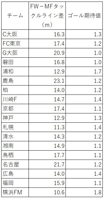 下表の通り、チームごとにFW-MFタックルライン差(m)と平均ゴール期待値を集計しました。
