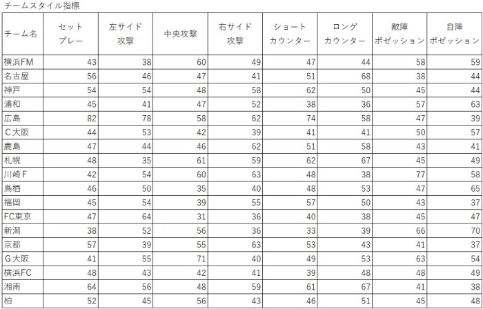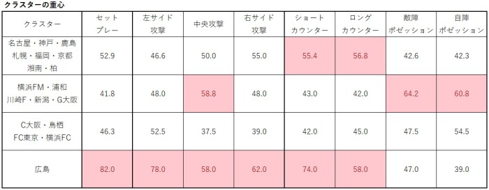 広島が突出していることが分かります。セットプレーの数値が高く、サイド別に見ても、左サイド・中央攻撃・右サイドともに高く、特に左サイドの数値が高いです。ポゼッションよりもカウンター攻撃を志向し、カウンターの中でもショートカウンターを志向していることが分かります。