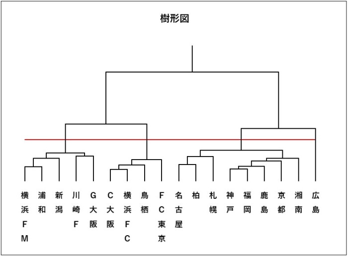 上表の数値を使いクラスター分析をしました。結果の樹形図は下図の通りです。