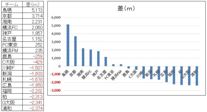 鳥栖が最も差が大きく5,173m、京都、湘南と続きます。