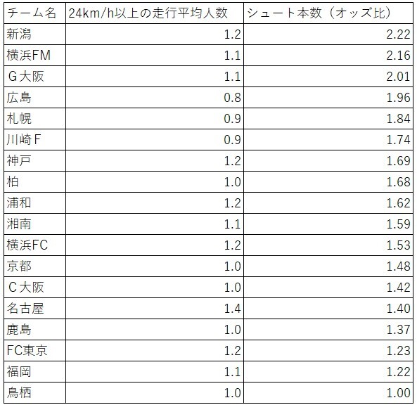 実際のシュート本数は計算できないため、オッズ比を計算しました。シュート本数が最も少ない鳥栖を1.00とすると、最も多いのが新潟で2.22となりました。鳥栖と新潟では2倍以上の差があるということです。