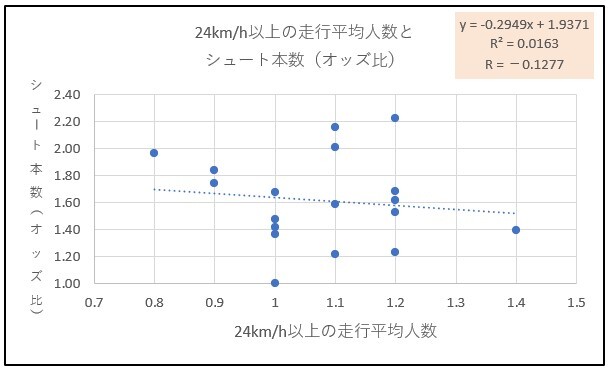 24km/h以上の走行平均人数とシュート本数(オッズ比)を下記の通り散布図にしました。