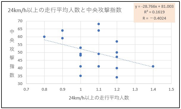 24km/h以上の走行平均人数と中央攻撃指数を散布図にしたところ、下記の通りになりました。
