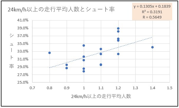 次は24km/h以上の走行平均人数とシュート率の関係です。
