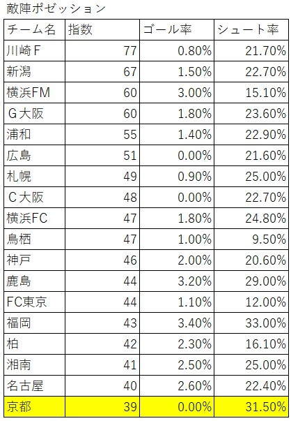 京都の指数は最も低い39でした。シュート率は2番目に高いのですが、ゴール率は0.00%。恐らく1点も取っていないのでしょう。