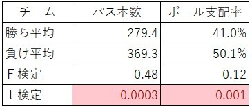 Football LABさんにある指標(チャンスビルディングポイントやスタッツ等)から、勝ち、引分、負けごとに平均値を算出し、勝ちと負けの有意差検定を行いました。