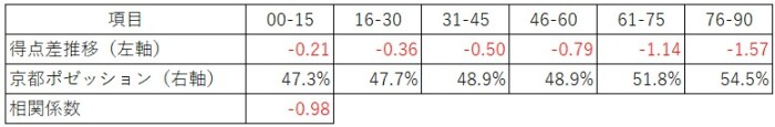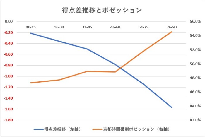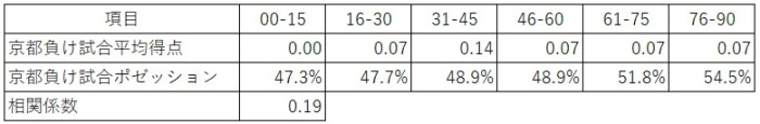 これを見る限り、あくまで平均ではありますが、京都は負け試合の時は15分終了時から相手にリードを奪われていることが分かります。そして逆転することなく試合終了を迎えています。あくまで平均です。