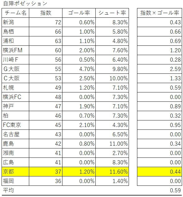 指数とゴール率をかけた数値を載せました。平均0.59に対して、京都は0.44でした。ゴール率が高いといっても元々の指数が低いため、結果としてのゴール数も少ないようです。