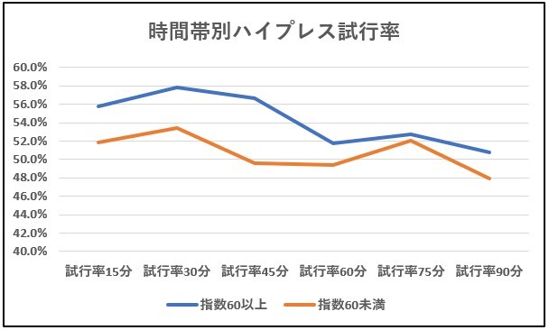 ハイプレス指数が高い「指数60以上」群の方が試行率は断然高いです。