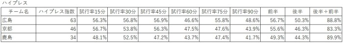 下表は2022シーズンのチーム別ハイプレス指数と時間帯別ハイプレス試行率です。