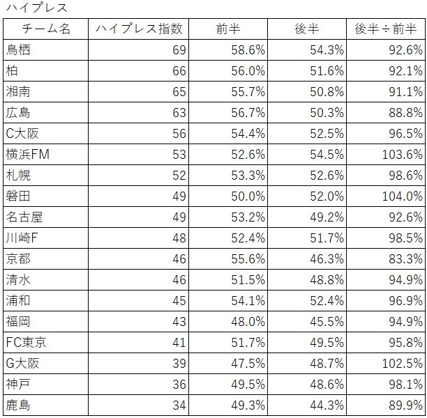 ハイプレス指数が高いのは鳥栖(69)、柏(66)、湘南(65)、広島(63)です。