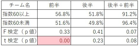 指数60以上と指数60未満において、前半の試行率は有意差有り(t検定のp値が1%未満)でしたが、後半は有意差は認められませんでした。