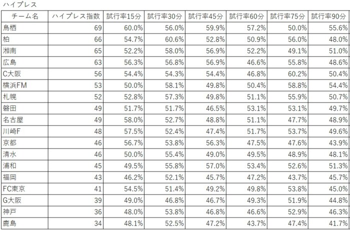 Football LABにはスコア状況別ハイプレスデータもありますが、今回はスコアを無視して計算しました。