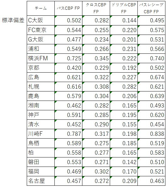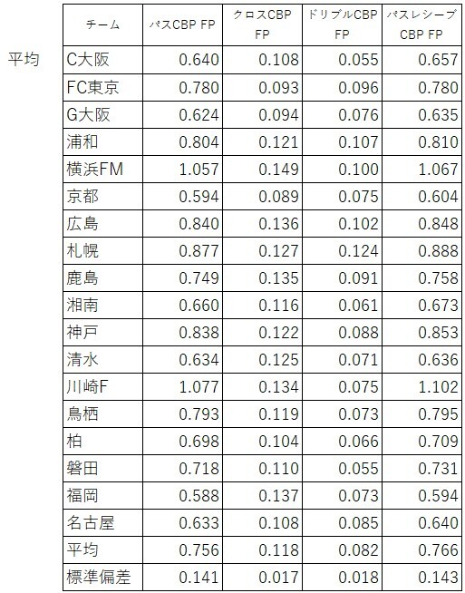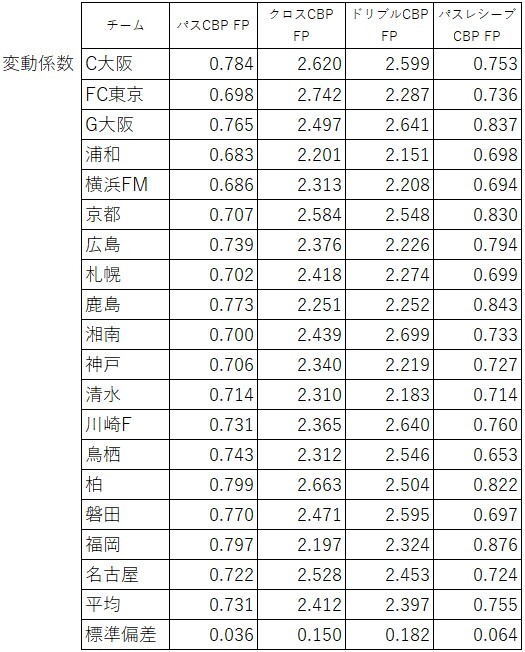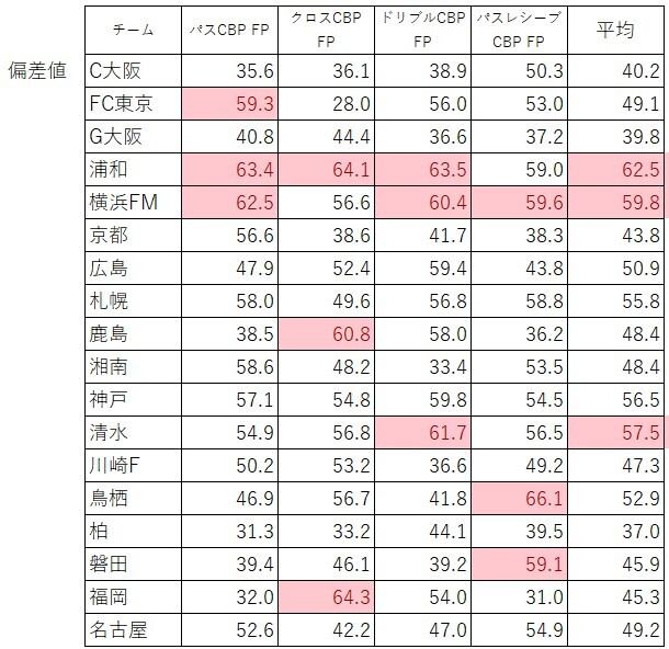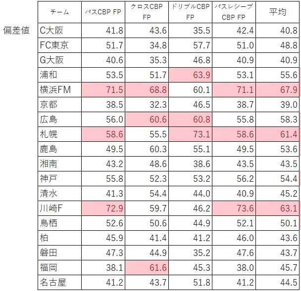 パスCBPとパスレシーブCBPの上位3チームは前述したチームと同様であるが、クロスCBPには広島と福岡が入り、ドリブルCBPでは浦和と広島が上位3チームに入っている。