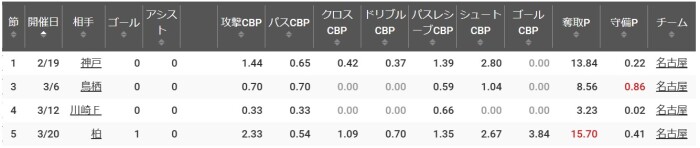 Football LABには選手ごと試合ごとの下記データ(一部割愛)がある。